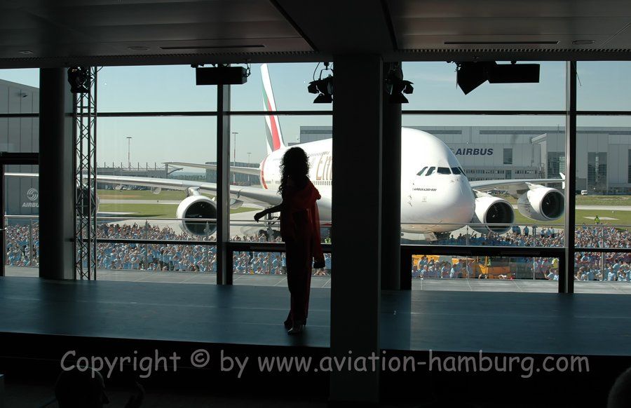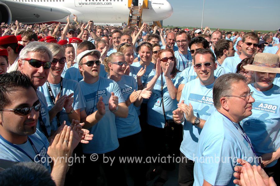 Ahora llego la hora, un momento inexplicable, lleno de emocion, se apagaron las luces y se levanto el telón, donde los trabajadores de Airbus en Hamburgo acompañan al primer A380 que se entrega en la planta de Finkenwerder.